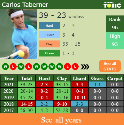 Taberner has an overall 39-23 win-loss record in 2021, 3-4 on indoor hard courts (See FULL STATS).