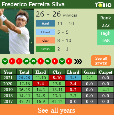 In terms of his career, Frederico has an overall 397-226 record. He has a negative 16-17 record on indoor hard courts.