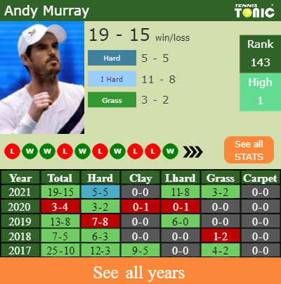 Andy has a compiled 19-15 win-loss record in 2021, 11-8 on indoor hard courts (See FULL STATS).