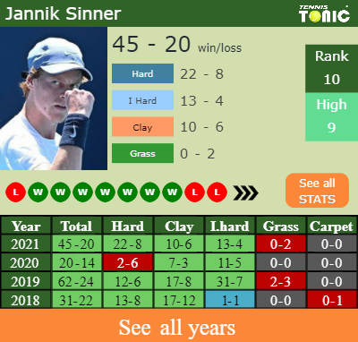 Jannik has an aggregate 45-20 win-loss record in 2021, 13-4 on indoor hard courts (See FULL STATS).
