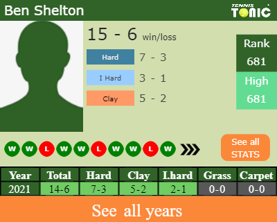 The American has an aggregate 14-6 win-loss record in 2021, 2-1 on indoor hard courts (See FULL STATS).