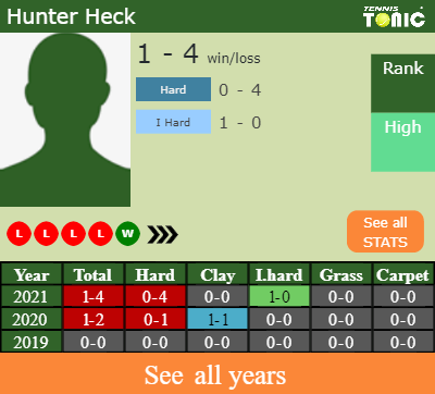 Heck has a negative match record in the last 3 years having won 25% of his matches (2-6). 1-0 on indoor hard courts in 2021. Regarding his performance on the same surface of this competition, Heck has a composed1-0 win-loss record in the last 3 years on indoor hard courts.