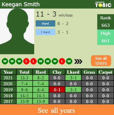 Smith has a solid match record in the last 6 years having won 67% of his matches (62-30). 3-1 on indoor hard courts in 2021. Talking about his performance on the same surface of this tournament, Smith has a compiled8-3 win-loss record in the last 6 years on indoor hard courts.
