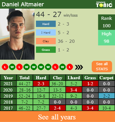 Altmaier has a composed 44-27 win-loss record in 2021, 2-3 on hard (See FULL STATS).