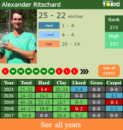 In terms of his career, Ritschard has an overall 223-138 record. He has a positive 28-26 record on indoor hard courts.