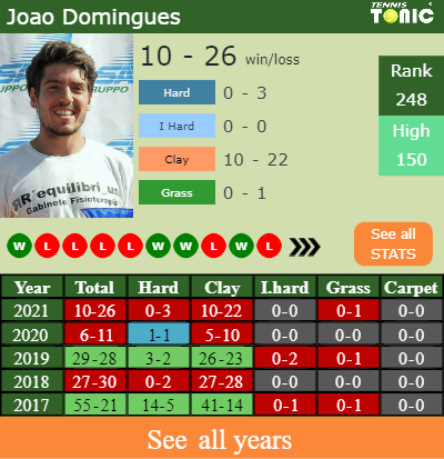Domingues has an aggregate 10-26 win-loss record in 2021, 10-22 on clay (See FULL STATS).