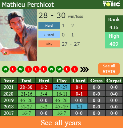 The French player has a compiled 28-30 win-loss record in 2021, 27-27 on clay (See FULL STATS).