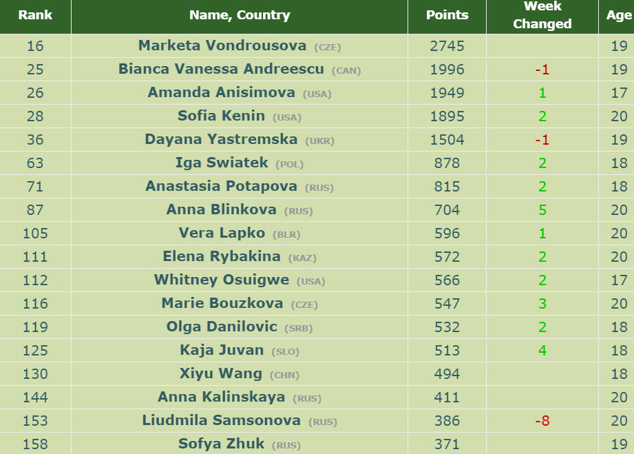 Marketa Vondrousova, Bianca Andreescu, and Amanda Anisimova are still the leaders of the young generation in the WTA ranking.