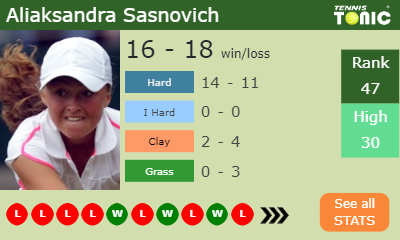 Sasnovich has a 16-18 win-loss record in 2019, 14-11 on hard (See FULL STATS).