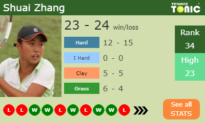 Zhang has a 23-24 win-loss record in 2019, 12-15 on hard (See FULL STATS).