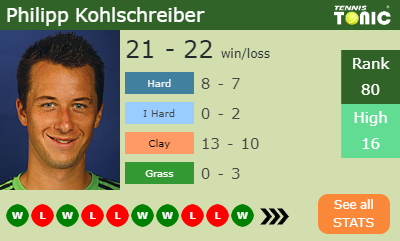 Kohlschreiber has a 21-22 win-loss record in 2019, 13-10 on clay (See FULL STATS).