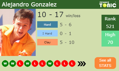Alejandro has a 10-17 win-loss record in 2019, 5-10 on clay (See FULL STATS).