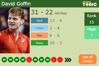 Goffin has a 31-22 win-loss record in 2019, 13-9 on hard (See FULL STATS).