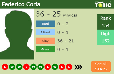 Coria has a 36-25 win-loss record in 2019, 36-21 on clay (See FULL STATS).