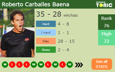 This will be the 4th time that Roberto Carballes Baena and Jozef Kovalik square off. The head to head is 2-1 for Carballes Baena (see full H2H stats), 2-1 on clay.