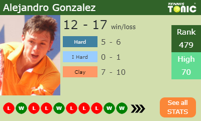 Alejandro has a 12-17 win-loss record in 2019, 7-10 on clay (See FULL STATS).