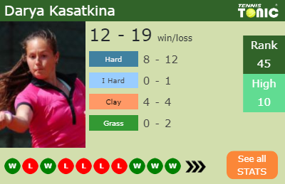 Kasatkina has a 12-19 win-loss record in 2019, 8-12 on hard (See FULL STATS).