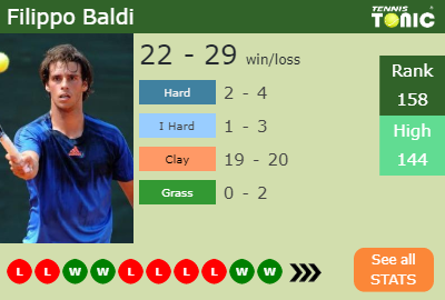 This will be the 4th time that Filippo Baldi and Alessandro Giannessi fight against each other. The head to head is 3-0 for Giannessi (see full H2H stats), 3-0 on clay.