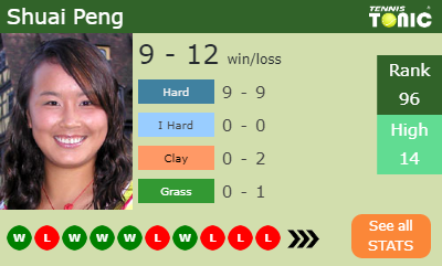 Peng has a 9-12 win-loss record in 2019, 9-9 on hard (See FULL STATS).