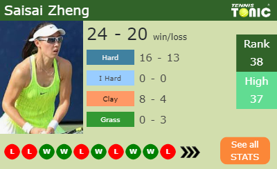Zheng has a 24-20 win-loss record in 2019, 16-13 on hard (See FULL STATS).