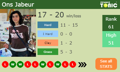 Jabeur has a 17-20 win-loss record in 2019, 11-15 on hard (See FULL STATS).