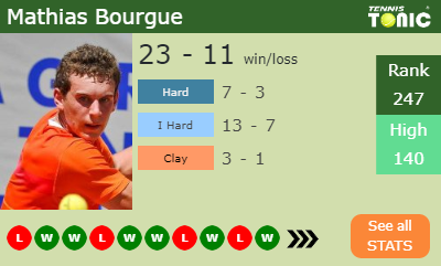 This will be the 2nd time that Alexandre Muller and Mathias Bourgue play each other. The head to head is 1-0 for Muller (see full H2H stats), but they have never played each other on I.hard.