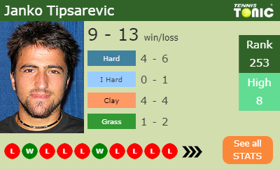 Tipsarevic has a 9-13 win-loss record in 2019, 0-1 on I.hard (See FULL STATS).
