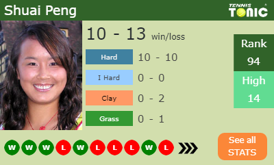 Peng has a 10-13 win-loss record in 2019, 10-10 on hard (See FULL STATS).