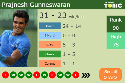 Prajnesh has a 31-23 win-loss record in 2019, 24-14 on hard (See FULL STATS).