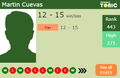 Cuevas has a 12-15 win-loss record in 2019, 12-15 on clay (See FULL STATS).