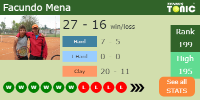 This will be the 4th time that Facundo Mena and Daniel Elahi Galan play each other. The head to head is 3-0 for Mena (see full H2H stats), 2-0 on clay.