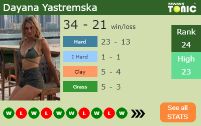 Dayana has a 34-21 win-loss record in 2019, 23-13 on hard (See FULL STATS).