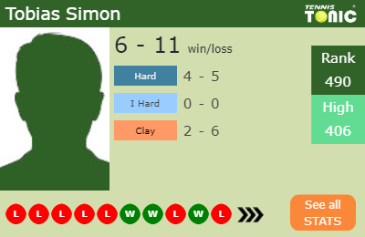 Tobias has a 6-11 win-loss record in 2019, 0-0 on carpet (See FULL STATS).