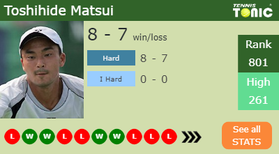 Toshihide has a 8-7 win-loss record in 2019, 8-7 on hard (See FULL STATS).