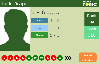 Draper has a 5-6 win-loss record in 2019, 1-1 on indoor hard courts (See FULL STATS).