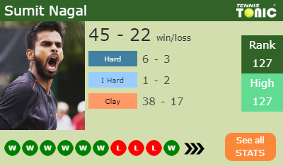 Sumit has a 45-22 win-loss record in 2019, 6-3 on hard (See FULL STATS).