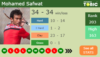 Safwat has a 34-34 win-loss record in 2019, 1-2 on indoor hard courts (See FULL STATS).