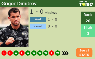 Dimitrov has a 1-0 win-loss record in 2020, 1-0 on hard (See FULL STATS).