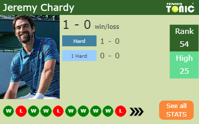 Chardy has a 1-0 win-loss record in 2020, 1-0 on hard (See FULL STATS).
