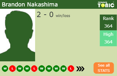 Nakashima has a 2-0 win-loss record in 2020, 2-0 on indoor hard courts (See FULL STATS).