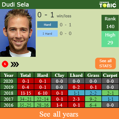 Dudi has a 0-1 win-loss record in 2020, 0-1 on hard (See FULL STATS).