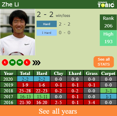 Li has a 2-2 win-loss record in 2020, 2-2 on hard (See FULL STATS).