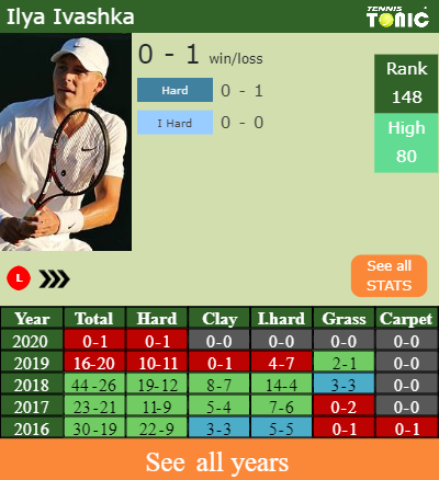 The Belarussian has a 0-1 win-loss record in 2020, 0-1 on hard (See FULL STATS).