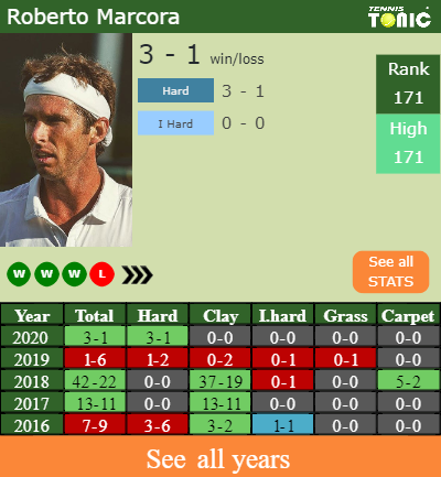 Roberto has a 3-1 win-loss record in 2020, 3-1 on hard (See FULL STATS).