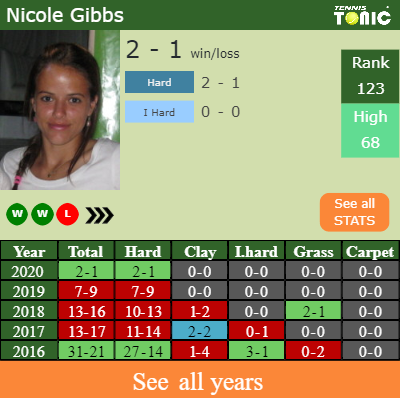 Nicole has a 2-1 win-loss record in 2020, 2-1 on hard (See FULL STATS).