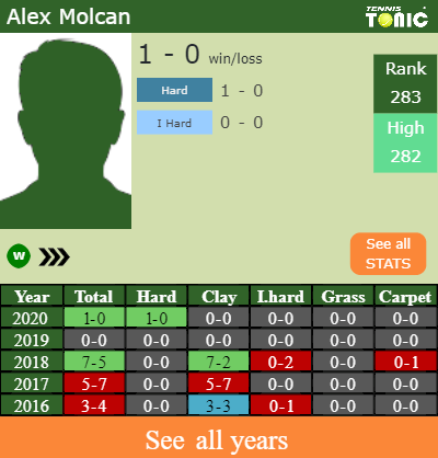 Molcan has a solid record in the last 7 years having won 67% of his matches (8-4). 1-0 on hard in 2020 In connection with his performance on same surface of tournament, Molcan has a 23-27 win-loss record in the last 7 years on hard.