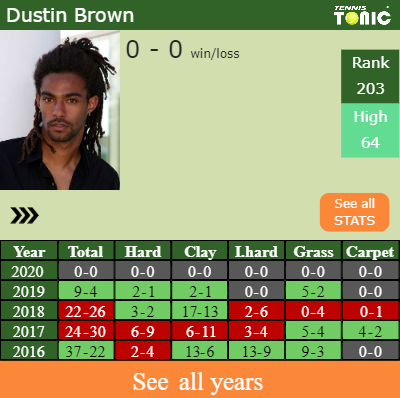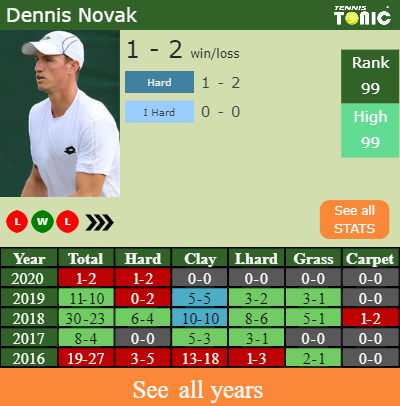This will be the 3rd time that Dennis Novak and Dustin Brown face off. The head to head is 1-1 (see full H2H stats), 1-0 on hard.
