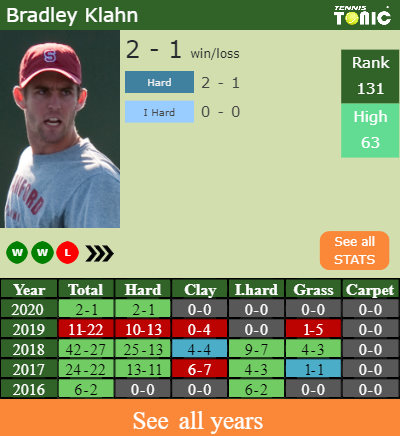 Klahn has a 2-1 win-loss record in 2020, 2-1 on hard (See FULL STATS).