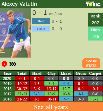 Alexey has a 0-1 win-loss record in 2020, 0-1 on hard (See FULL STATS).