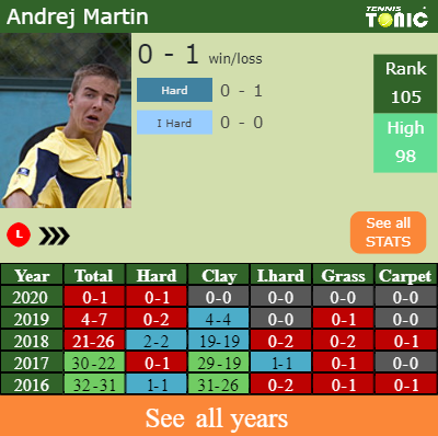 Martin has a 0-1 win-loss record in 2020, 0-1 on hard (See FULL STATS).